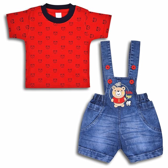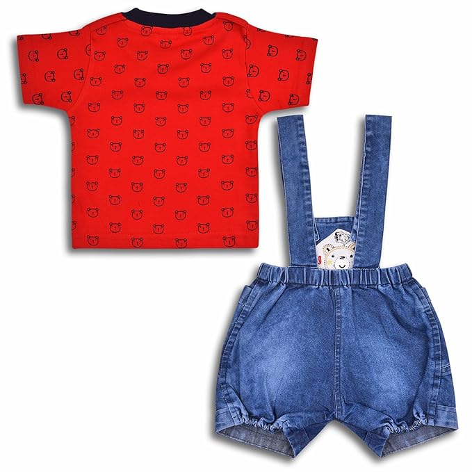 This boys printed clothing set includes a fun panda printed t-shirt and a stylish denim dungaree set. Perfect for any playful and fashionable boy, this set is a great addition to any wardrobe.
