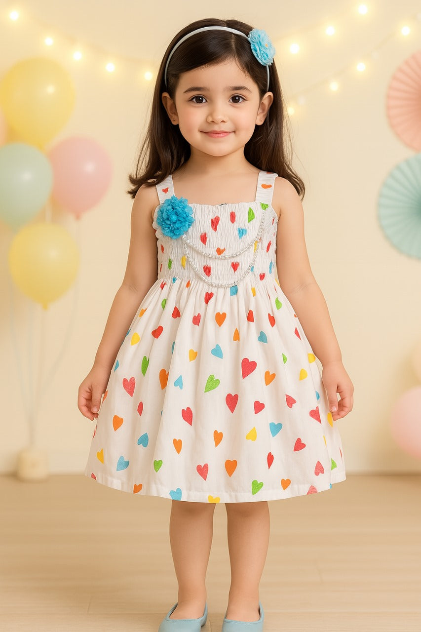 Girls Heart Print Smocking Casual Dress