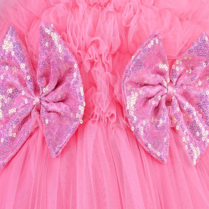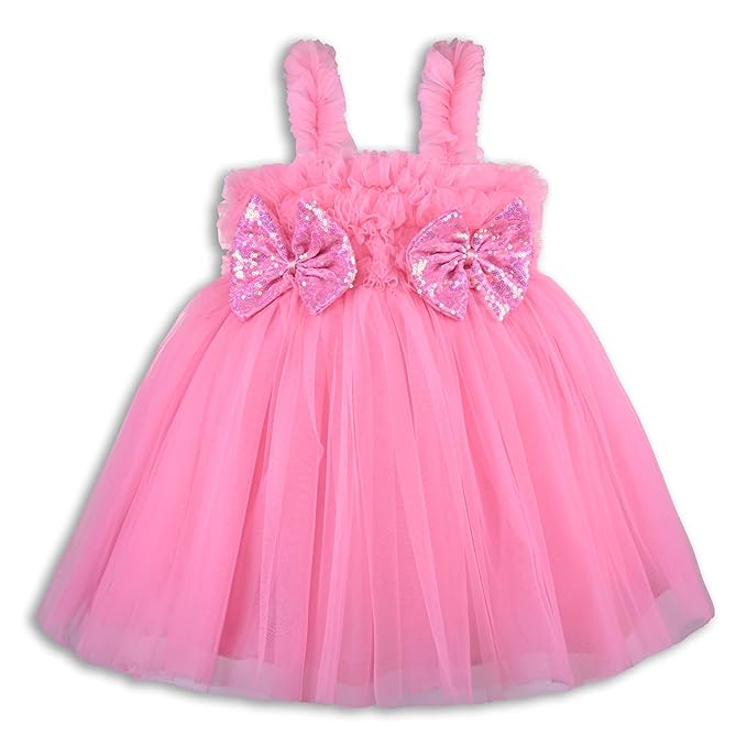 This party-ready dress features a flattering fit and flare silhouette with delicate bow detailing. Perfect for any special occasion, your little girl will feel confident and stylish in this embellished dress.