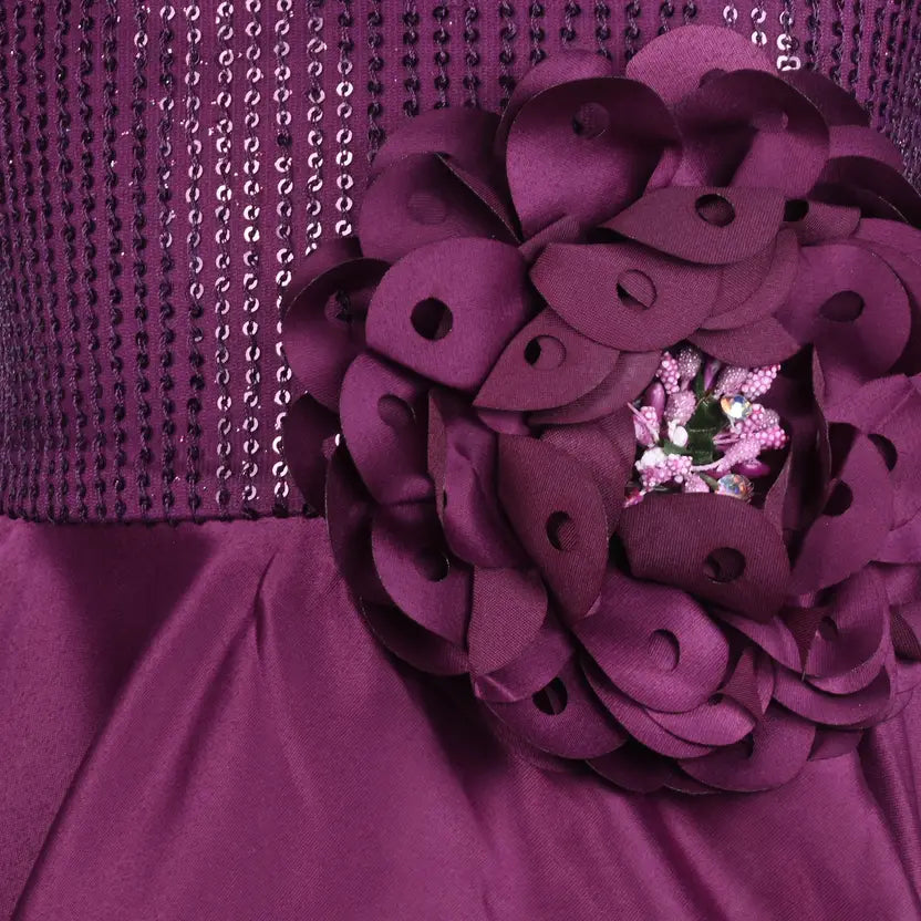 This girls’ full-length party dress features elegant floral applique on the waist with sparkling sequin embellishments on the body, creating a graceful and festive look. Made from soft, flowing satin fabric, it’s perfect for weddings, birthdays, and special occasions where she can shine in style.