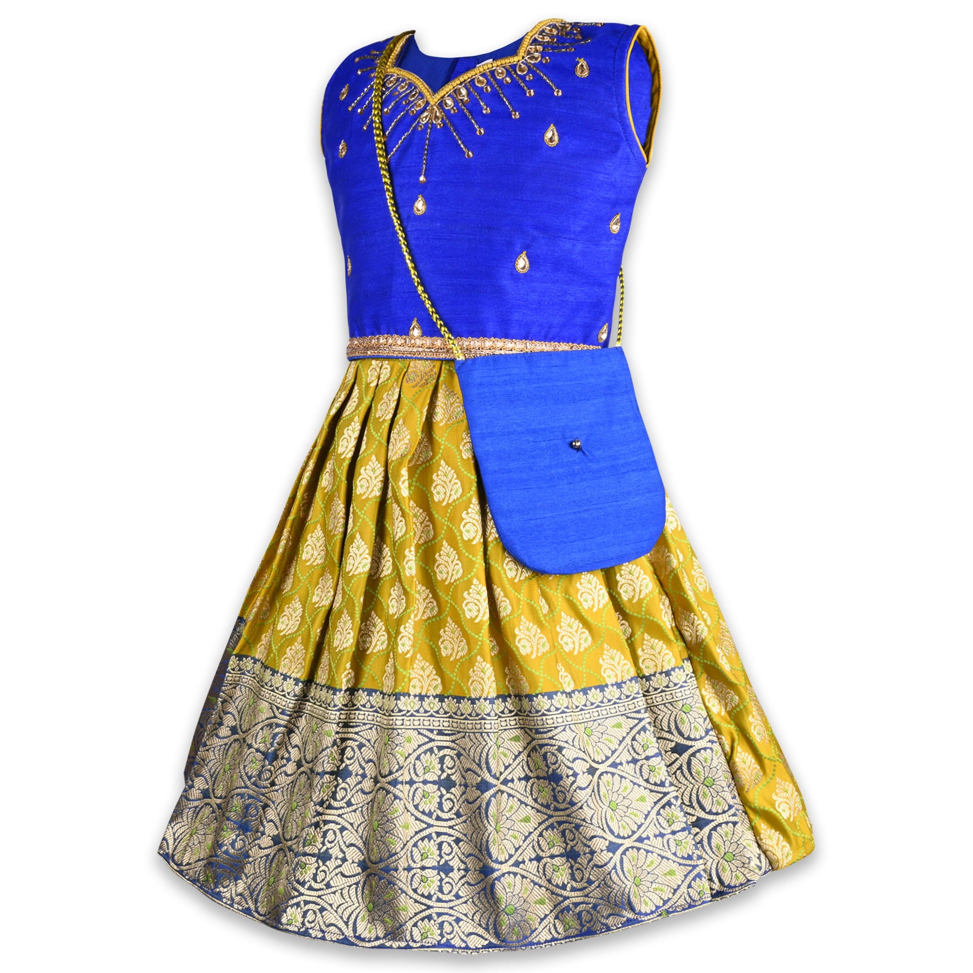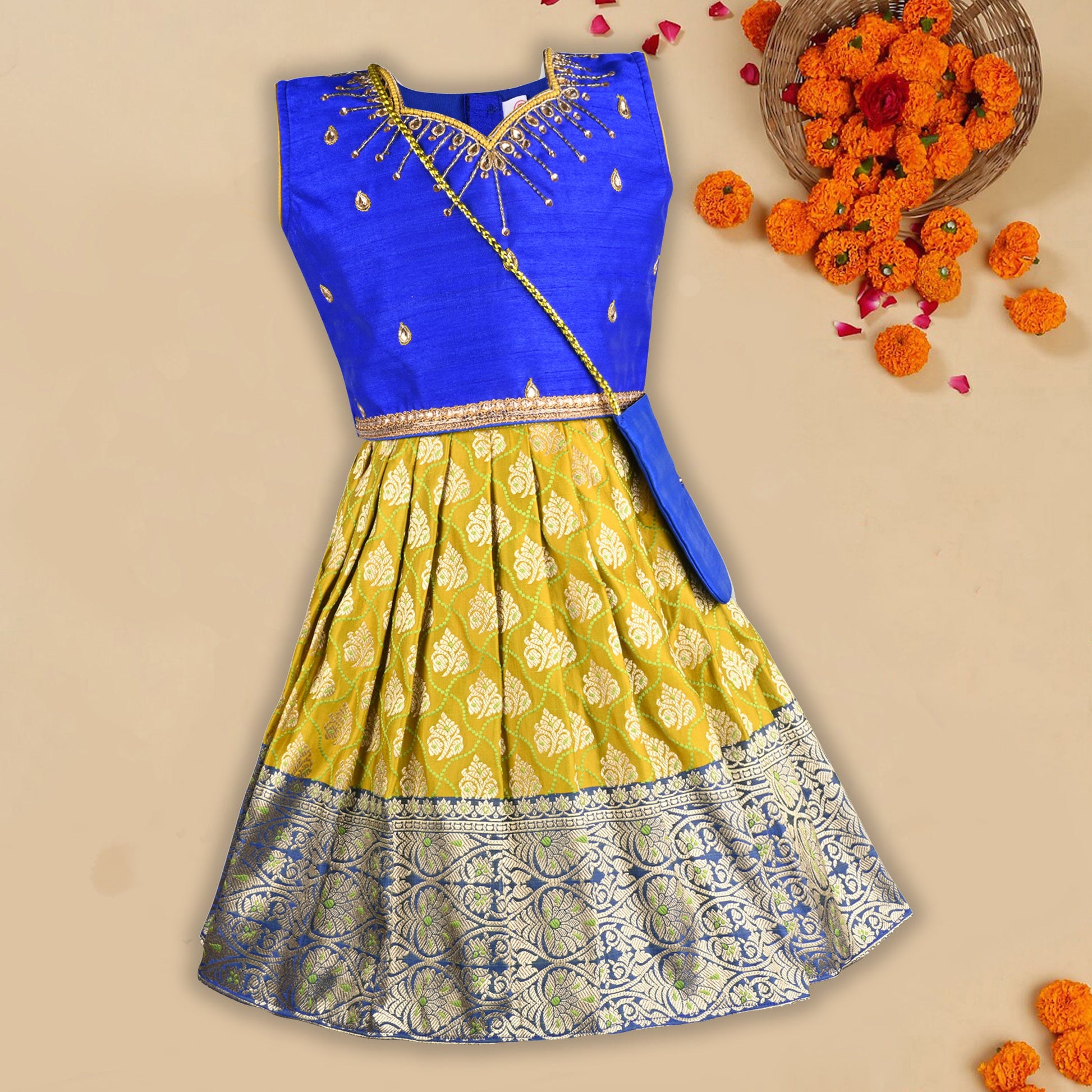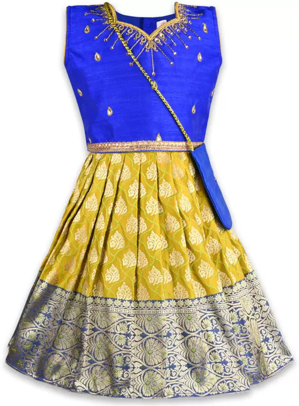 This girls' embellished ethnic lehenga choli set is a perfect choice for festive celebrations, weddings, and traditional events. Crafted from premium, lightweight fabric, it ensures comfort while maintaining a regal look. The choli (blouse) features intricate embroidery, sequins, or beadwork, adding a touch of elegance. Paired with a beautifully flared lehenga (skirt) adorned with rich embellishments and vibrant prints and weaves, it creates a graceful silhouette. The set is completed with a matching dupatta, enhancing its ethnic charm. Designed for easy wear with a comfortable fit, this outfit pairs well with traditional juttis and accessories for a stunning festive look.