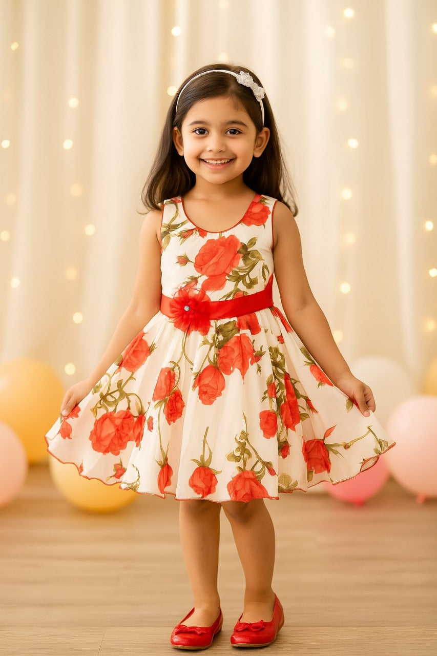 White and Red Floral Printed Bow Detail Dress - fr85TS-18-24_Mths